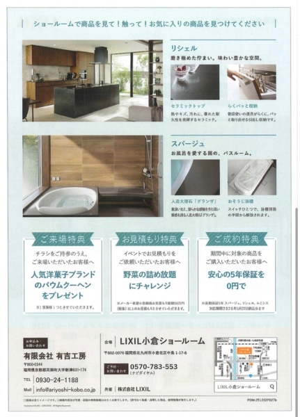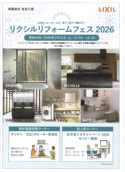 リクシルリフォームフェス2026 開催日時:2026年1月31日(土)10:00~16:30 開催場所:LIXIL小倉ショールーム 小倉北区中島1-17-6 ・ご来場特典、御見積特典、ご成約特典豪華特典ございます。 ・最新キッチン、日立IHヒーター実演会開催。お手持ちのIHの操作の疑問解決いたします。 ・住宅省エネキャンペーンセミナー2026開催です。 ①11:30~12:00 ②14:00~14:30 2026/01/05 11:53 Tweet
